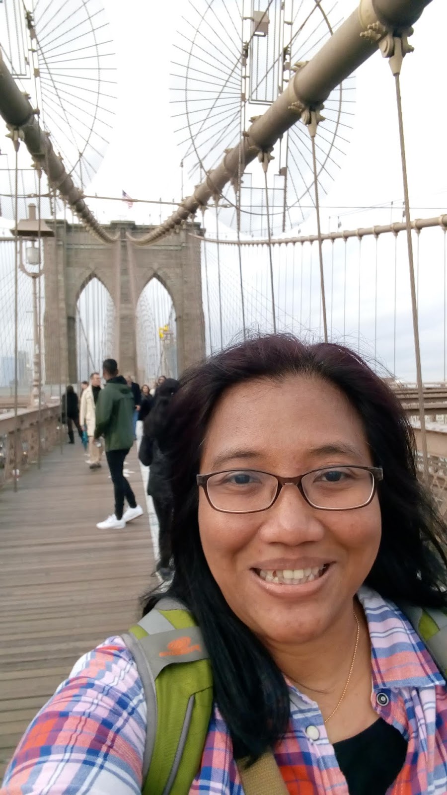 Akhirnya ketemu juga kita dengan jembatan icon kota NYC ini, jembatan ini ada 2 sisi jalur, sisi yang kanan khusus untuk orang yang bersepeda dan yang sebelah kiri khusus untuk orang yang berjalan kaki, lebar jembatannya tidak terlalu besar, hanya cukup untuk satu pejalan kaki bolak balik dan satu sepeda bolak balik, para pejalan kaki jangan coba-coba untuk berjalan di sisi tempat orang naik sepeda karena orang yang naik sepeda tidak segan2 untuk tidak berhenti demi menunggu kita berjalan artinya kita bisa saja di serempet oleh pengendara sepeda, mereka kadang suka bertampang kesal jika ada turis yang memblok jalan mereka, jika mau berfoto boleh aja tetapi jangan lengah sama sepeda ya, saya pernah baca ada kejadian orang ditabrak dan dimaki2 oleh orang yang bersepada karena dia sedang selfie di tengan2 jalur sepeda. Awalnya kita menyusuri jembatan ini tidak berniat untuk menyebrangnginya kita hanya hendak berfoto saja, namun kaki ini semakin jauh berjalan dan kata suami gw, tanggung sampai di tengah trus kita balik lagi akhirnya kita terus berjalan menybrangi jembatan sepanjang hampir 2km itu. Sampai-sampai gw merasa kegerahan di udara yang dingin ini, Wuff.. sebenarnya area sekeliling Brooklyn Bridge dari dua sisi sangat bagus hanya saja karena kaki udah gempor duluan jadinya kita kecapeaan, beristirahat sejenak di tamannya dan setelah ini hari sudah sore kami berdua akan kembali ke queens.